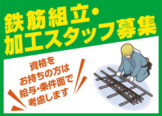 | 必要資格 | *学歴不問 *64歳以下(定年年齢が65歳のため) *普通自動車運転免許 *鉄筋施行技能士(1、2級) ※玉掛技能者、天井クレーン、その他の建設工事関係資格あれば尚可 |